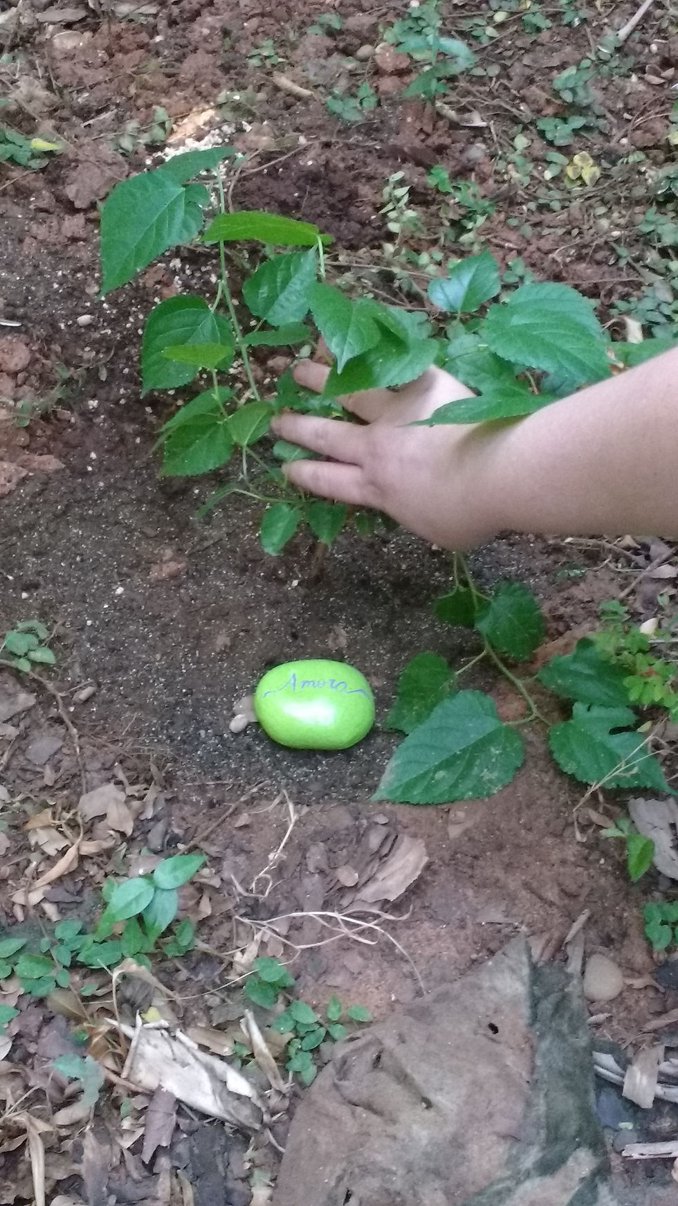 #pratodosverem Audiodescrição resumida: Foto de uma planta e uma pedra. Há folhas verdes, serrilhadas e em formato de coração, esparramadas pelo chão de terra. Há uma mão segurando as folhagens e, logo abaixo, uma pedra oval verde, escrito Amora em letra cursiva.